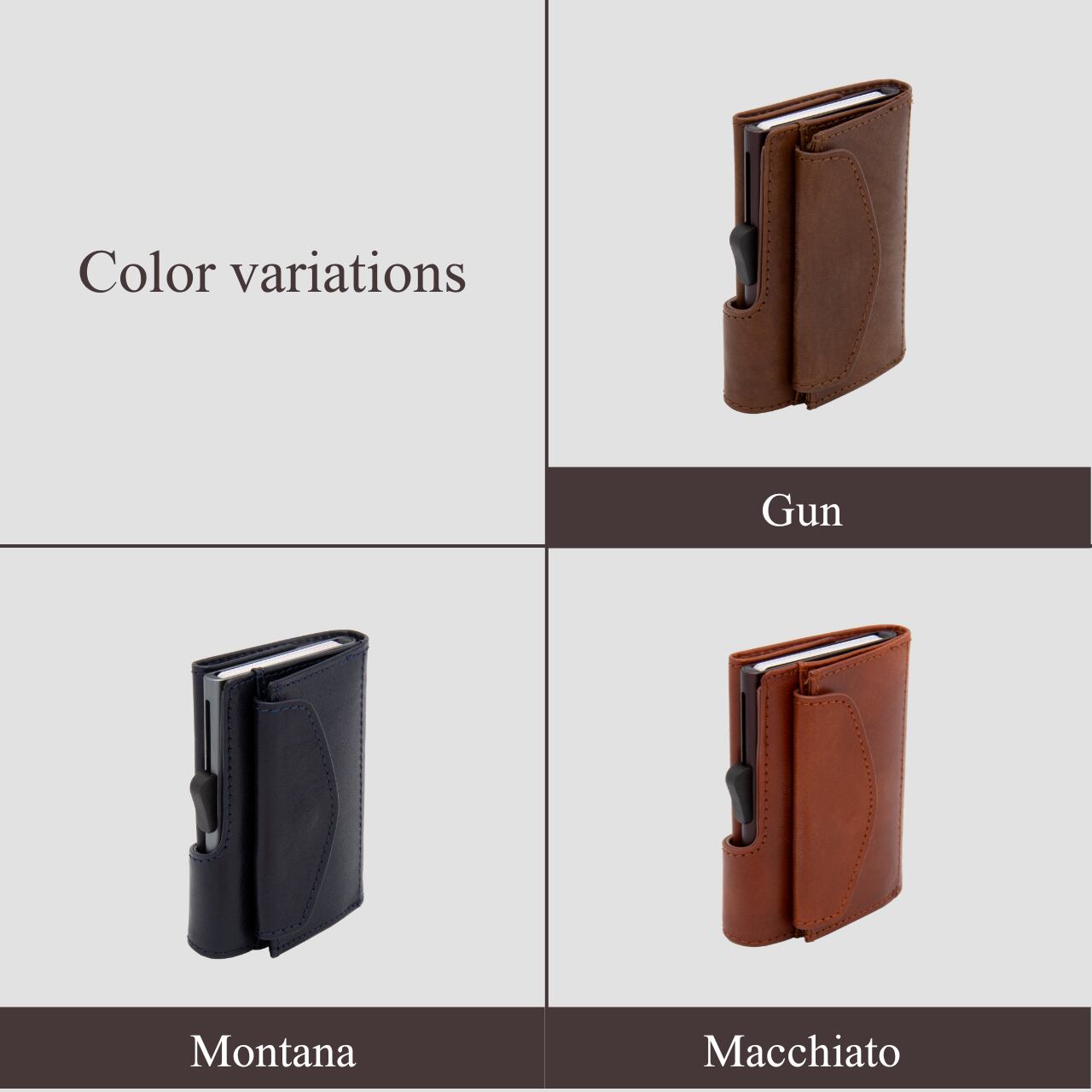 カラーは「Montana」「Gun」「Macchiato」の3種類から選べ、カードケースのサイズは「Lサイズ」と「Sサイズ」の2種類をご用意しています。