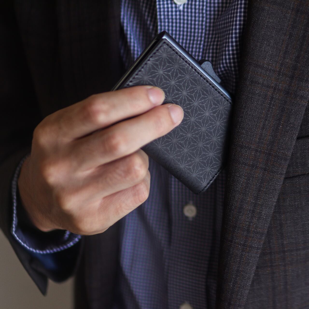 江戸時代から受け継がれる小紋柄を型押しした革を使用し、見る角度や光の当たり方によって異なる表情を楽しめる逸品です。
