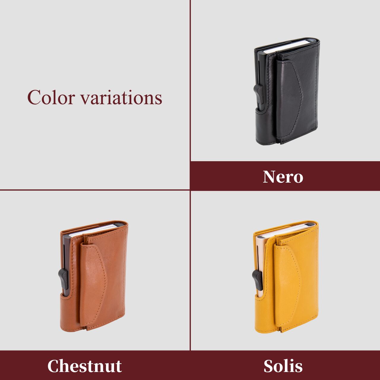 カラーは「Montana」「Gun」「Macchiato」の3種類から選べ、カードケースのサイズは「Lサイズ」と「Sサイズ」の2種類をご用意しています。