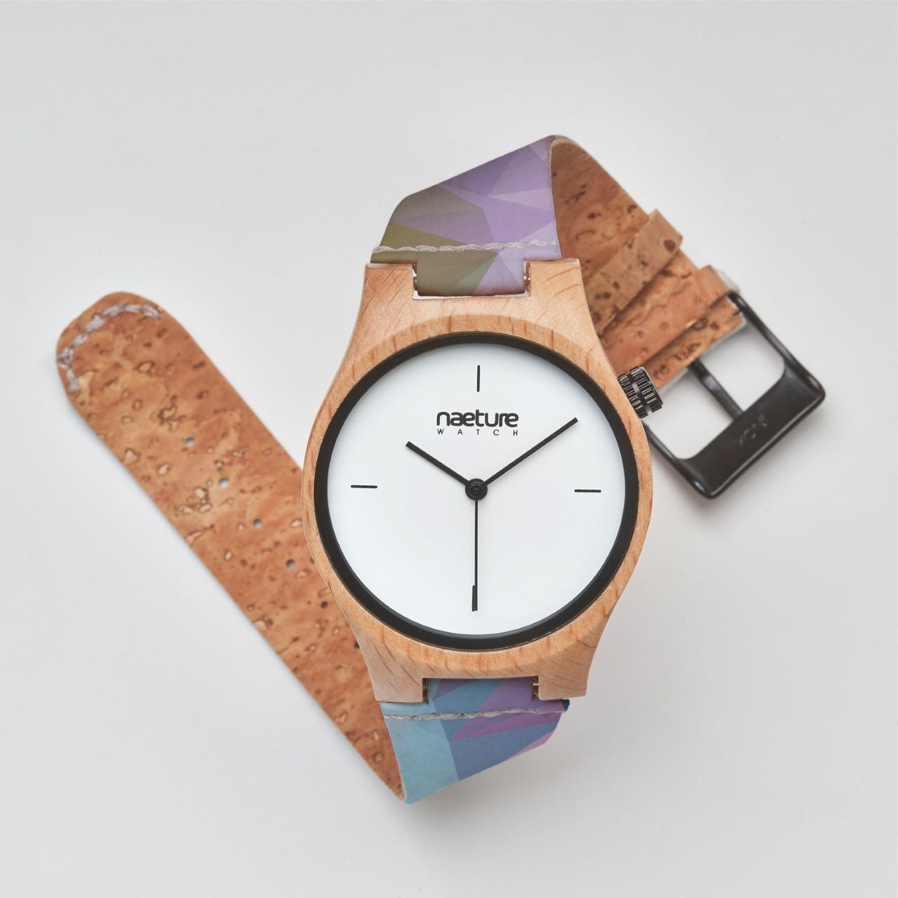 時計本体には温かみのあるブナの木を使用し、ベルトには軽量で丈夫なコルクとセルロースを採用。